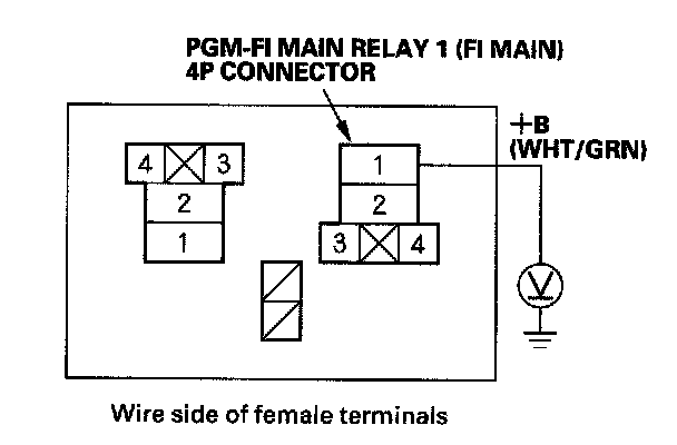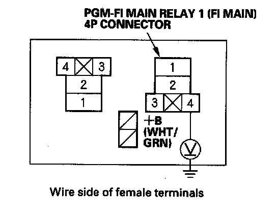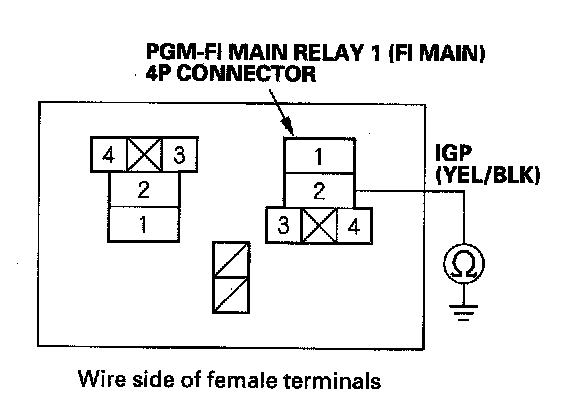 38. Check for continuity between body ground and PGM-FI main relay 1 (FI MAIN) 4P connector terminals No. 1 and No. 4 individually.