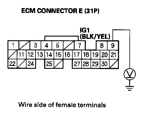 58. Measure voltage between ECM connector terminal E9 and body ground.