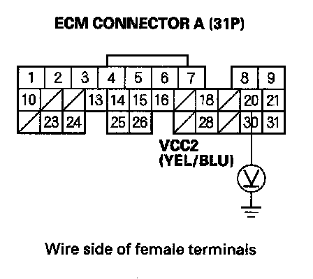 83. Disconnect the connector from each of these sensors, one at a time, and measure voltage between body ground and ECM connector terminal A20 with the ignition switch ON (II).