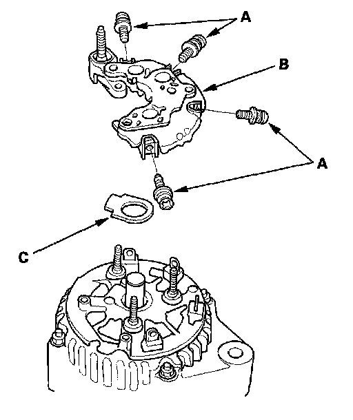 4. Remove the three flange nuts (A) and the screw (B) from the alternator, then remove the plate terminal (C).