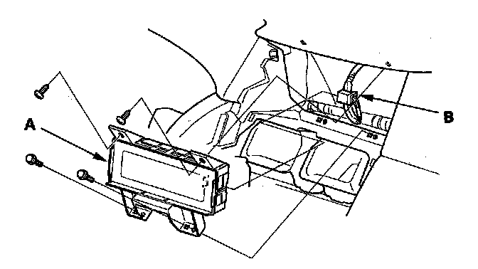 3. Disconnect the connector (B), and remove the audio-HVAC display unit.