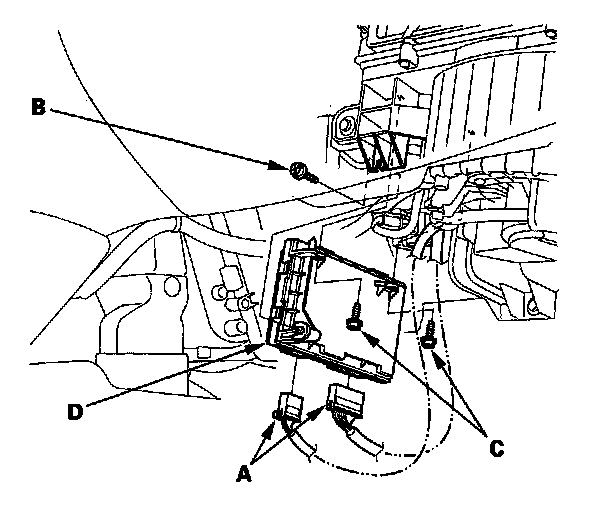2. Disconnect the connectors (A). Loosen the bolt (B) and remove the bolts (C) from the climate control unit (D).