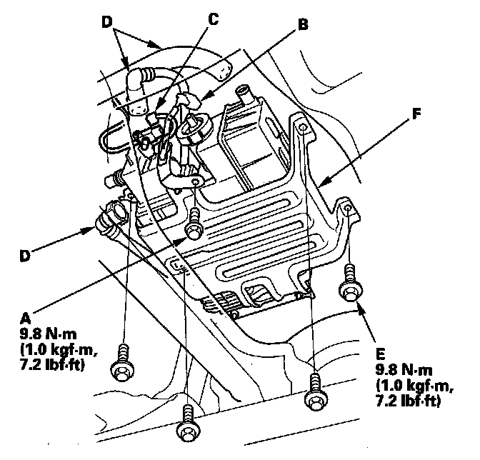 2. Remove the bolts (E), and move the EVAP canister assembly (F) to the rear.