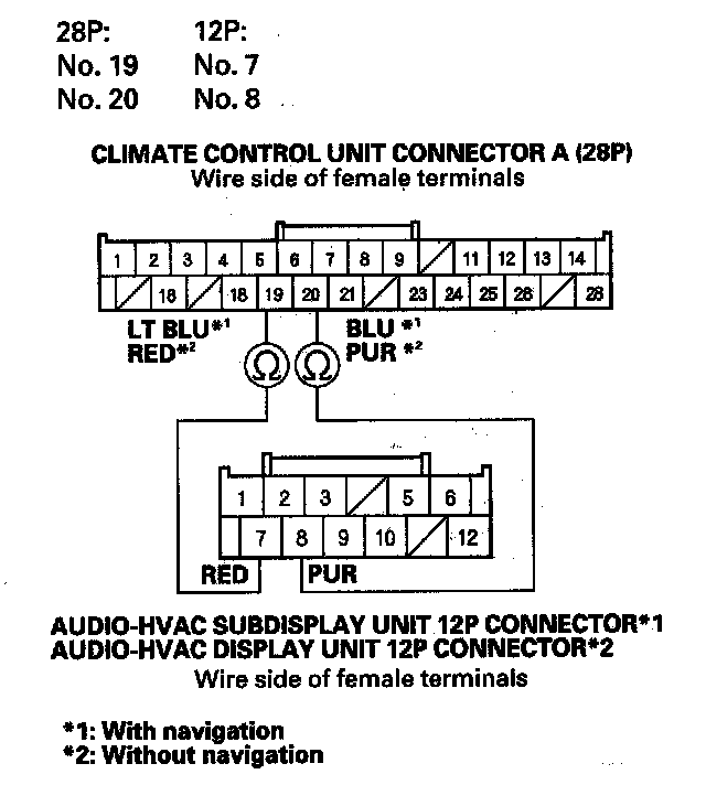 3. Check for continuity between the following terminals of climate control unit connector A (28P) and the audio-HVAC subdisplay or display unit 12P connector.
