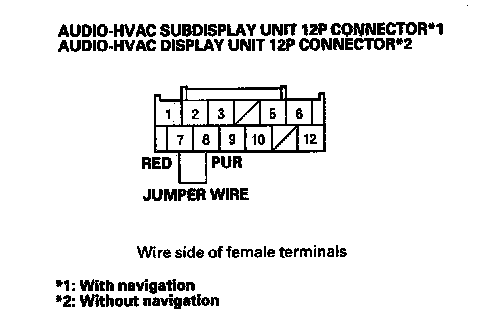 6. Connect the audio-HVAC subdisplay or display unit 12P connector No. 7 and No. 8 terminals with a jumper wire.