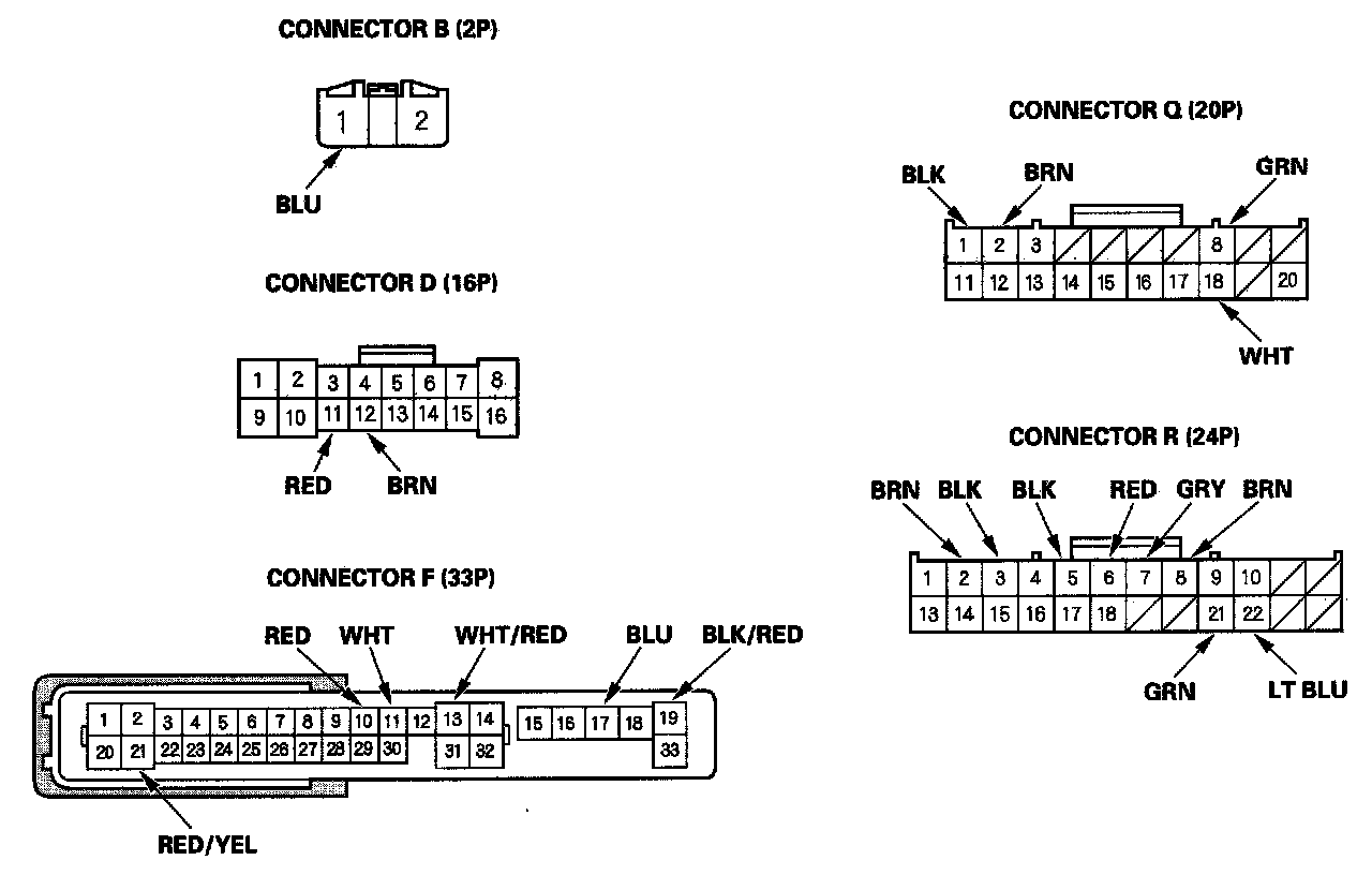 2. Disconnect driver's under-dash fuse/relay box connectors B, D, F, Q, and R.
