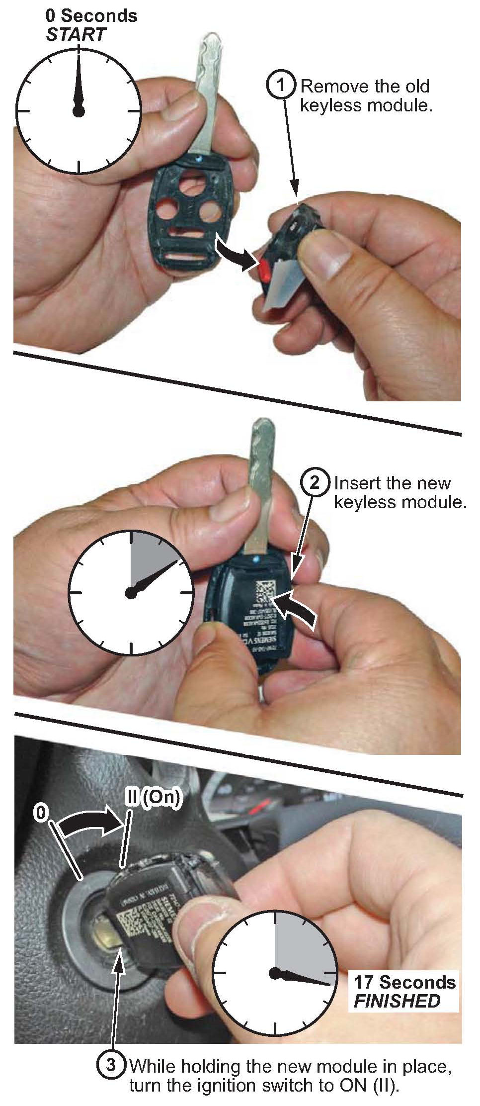 When you reach the step that asks you to install the new key, you must exchange the old and new keyless modules and turn the ignition switch to ON (II) within 17 seconds. If you don't do this within 17 seconds, you will need to redo the entire procedure.