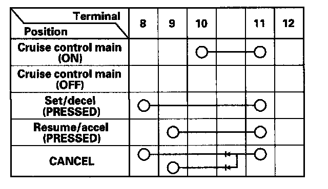 - If there is continuity, and it matches the table, but switch failure occurred on the cruise control input test, check and repair the wire harness on the switch circuit.