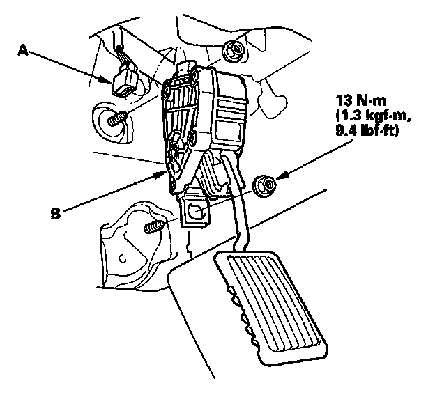 2. Remove the accelerator pedal module (B).