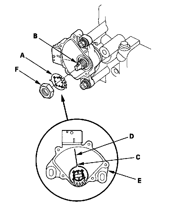 14. Install the new lock washer (A) over the control shaft (B) while aligning the projection (C) of the lock washer with the N positioning line (D) on the transmission range switch (E), and install the locknut (F).