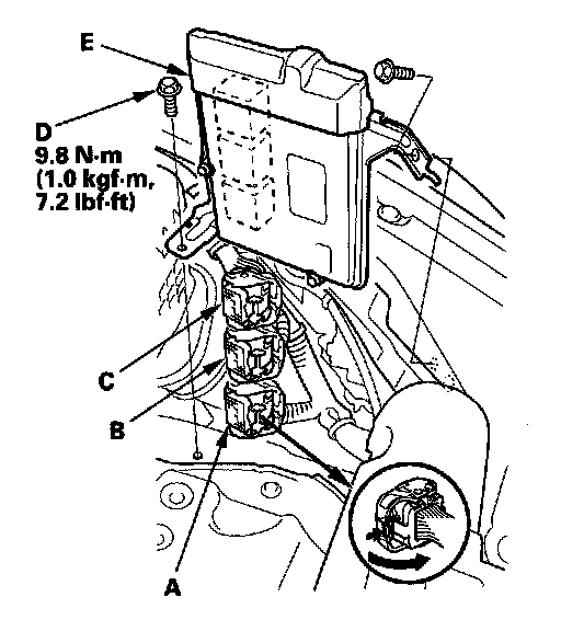9. Disconnect ECM/PCM connectors A, B, and C, then remove the ECM/PCM assembly (E).