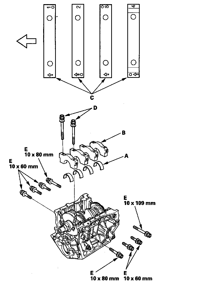 Tighten the bearing cap bolts, and then the bearing cap side bolts to the specified torque in the sequence as shown. Repeat the torque sequence again to ensure the bolts are properly torqued.