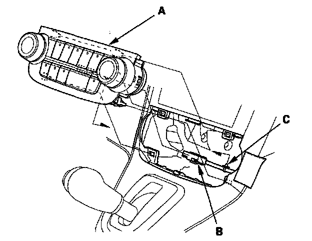 4. Remove the HVAC control unit (A). Disconnect the connector (B), then remove the harness clip (C).
