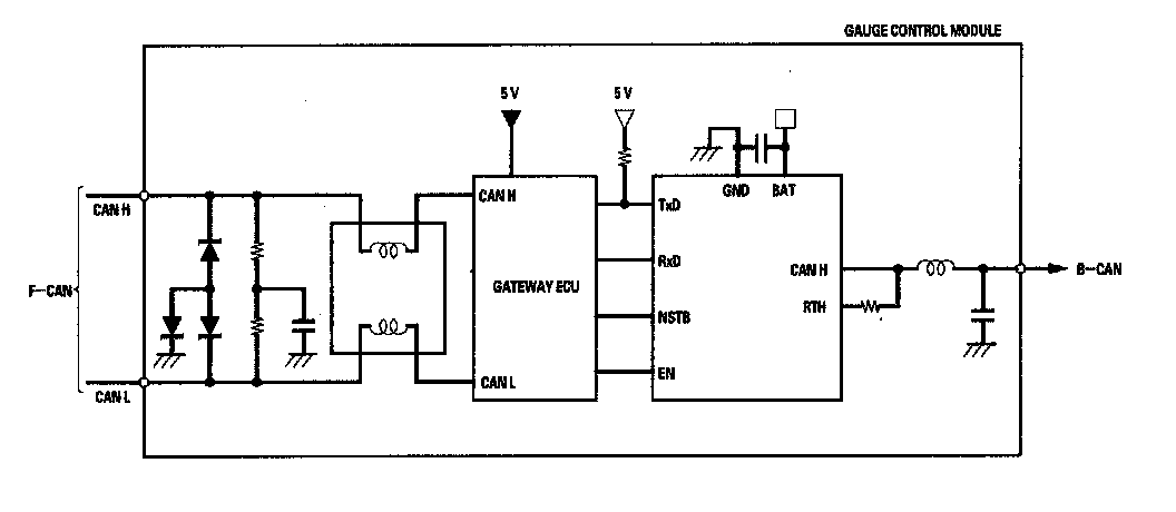 The body controller area network (B-CAN) and the fast controller area network (F-CAN) share information between multiple electronic control units (ECUs). B-CAN communication moves at a slower speed (33.33 kbps) for convenience related items and for other functions. F-CAN information moves at a faster speed (500 kbps) for "real time" functions such as fuel and emissions data. To allow both systems to share information, the gauge control module translates information from B-CAN to F-CAN and from F-CAN to B-CAN.