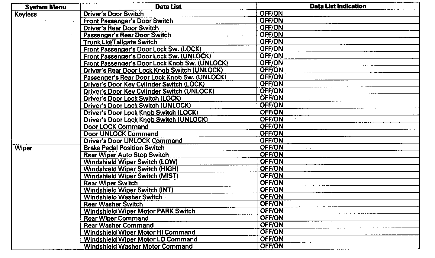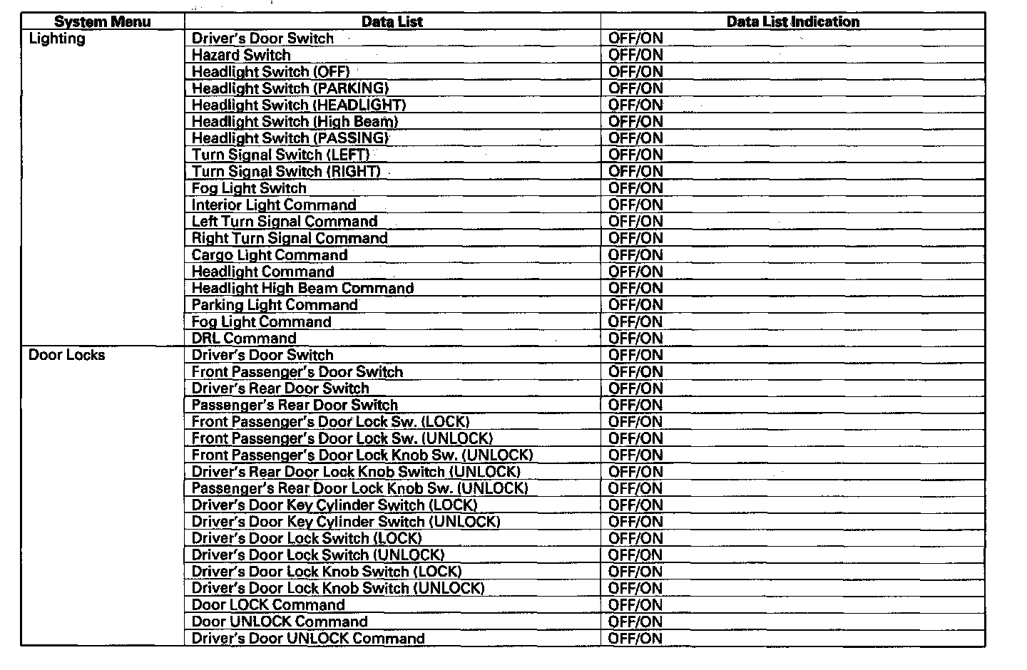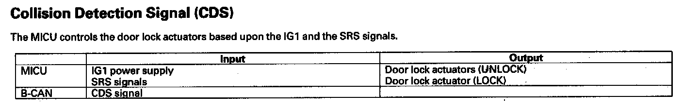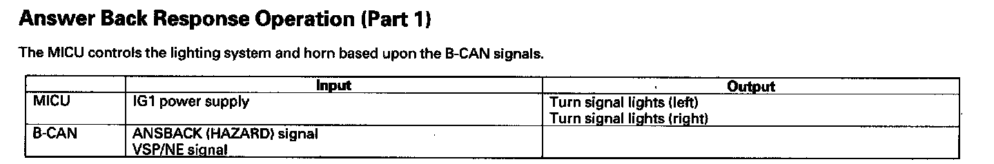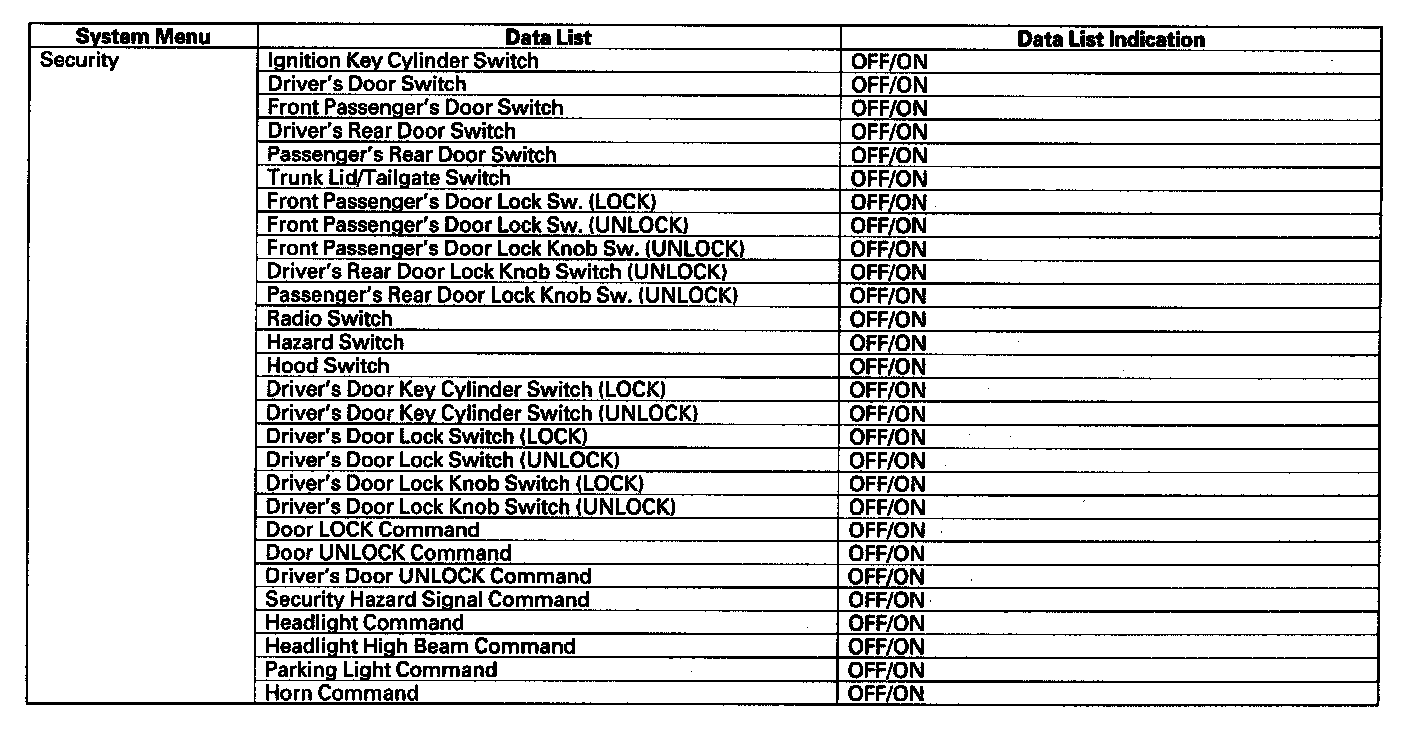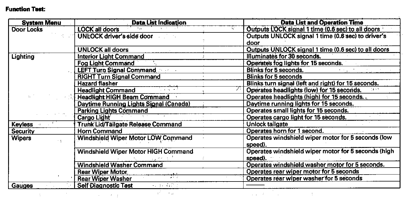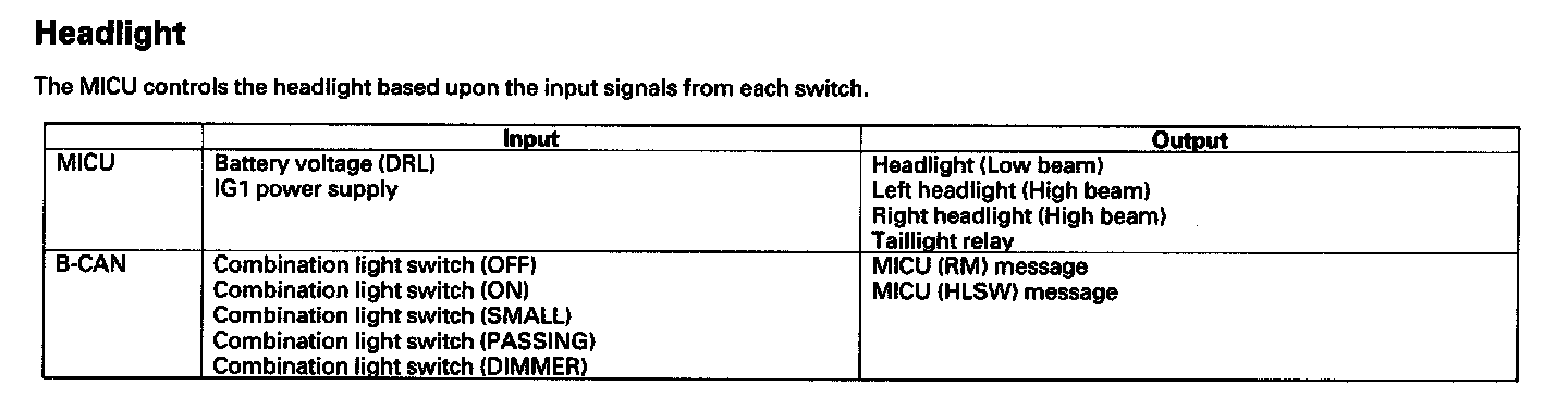 By connecting the HDS to the data link connector (DLC), the HDS can retrieve the diagnostic results from the MICU via a diagnostic line called K-LINE. The K-LINE is distinguished from the CAN line, and connected to the CAN related ECUs. The MICU is a gateway between the HDS and B-CAN related ECUs, and sends B-CAN diagnostic results to the HDS. When performing a function test with the HDS, the HDS sends an output signal through the K-LINE to the MICU. The MICU either relays the request to another ECU, or commands the function its self.