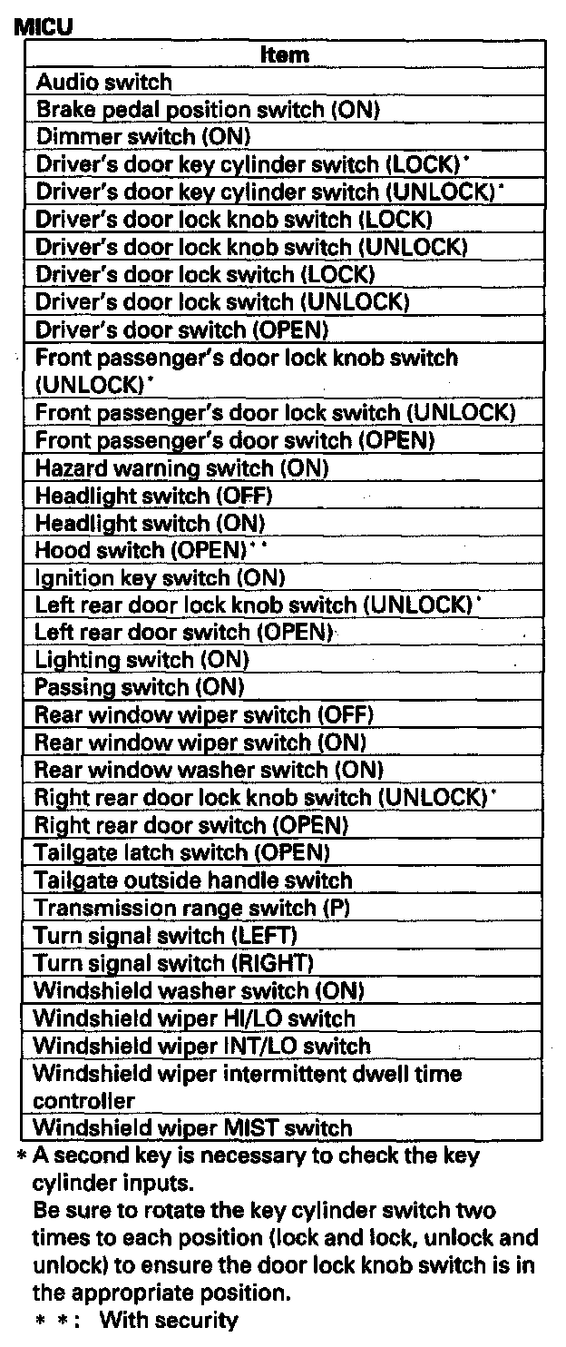 11. The following table lists the circuits that can be checked in Test Mode 2. Operate the switch that is most closely related to the problem. If the circuit is OK, the ceiling light will blink once. If the circuit is faulty, there will be no indication.