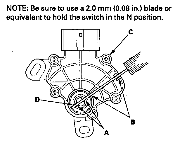6. Align the cutouts (A) on the rotary-frame with the neutral positioning cutouts (B) on the transmission range switch (C), then put a 2.0 mm (0.08 in.) feeler gauge blade (D) in the cutouts to hold the switch in the N position.
