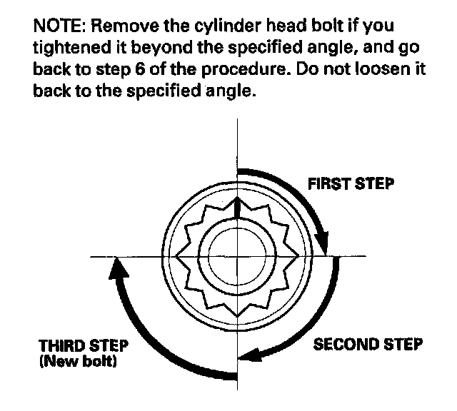 After torquing, tighten all cylinder head bolts in two steps (90° per step). If you are using a new cylinder head bolt, tighten the bolt an extra 90°.