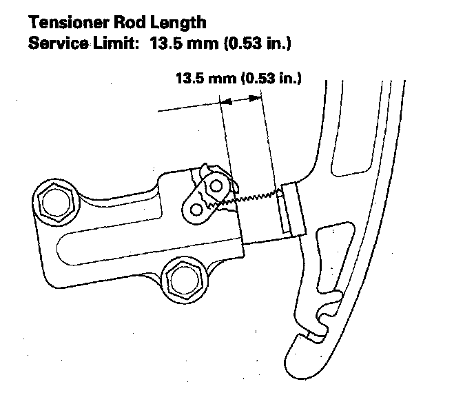 Measure the tensioner rod length between the tensioner body and bottom of the flat surface section on the tensioner rod. If the length is more than the service limit, replace the cam chain and the oil pump chain.