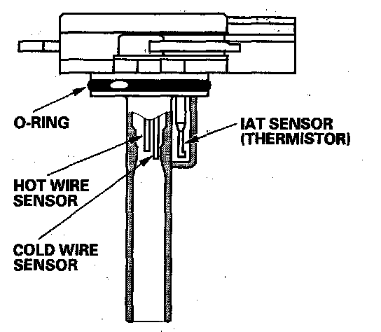 The mass air flow (MAF) sensor/intake air temperature (IAT) sensor contains a hot wire and a thermistor. It is located in the intake air passage. The resistance of the hot wire and thermistor changes due to intake air temperature and air flow. The control circuit in the MAF sensor controls the current to keep the hot wire at a set temperature. The current is converted to voltage in the control circuit, then output to the PCM.