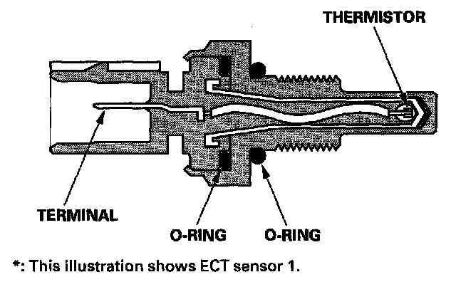 ECT sensors 1 and 2 are temperature dependent resistors (thermistors). The resistance decreases as the engine coolant temperature increases.