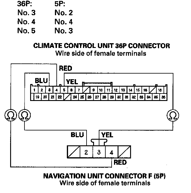 6. Check for continuity between the following terminals of the climate control unit 36P connector and navigation unit connector F (5P).