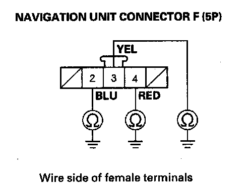 7. Check for continuity between body ground and navigation unit connector F (5P) No. 2, 3, and 4 terminals individually.