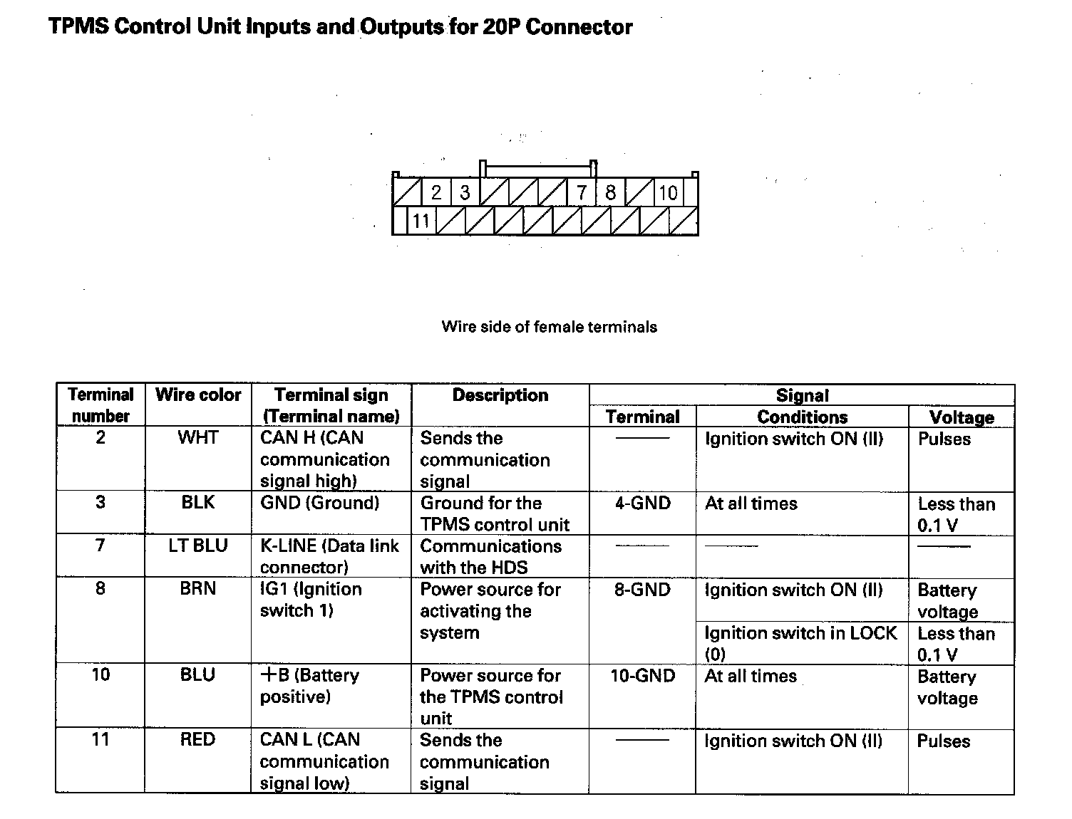 TPMS Control Unit Inputs and Outputs for 20P Connector: