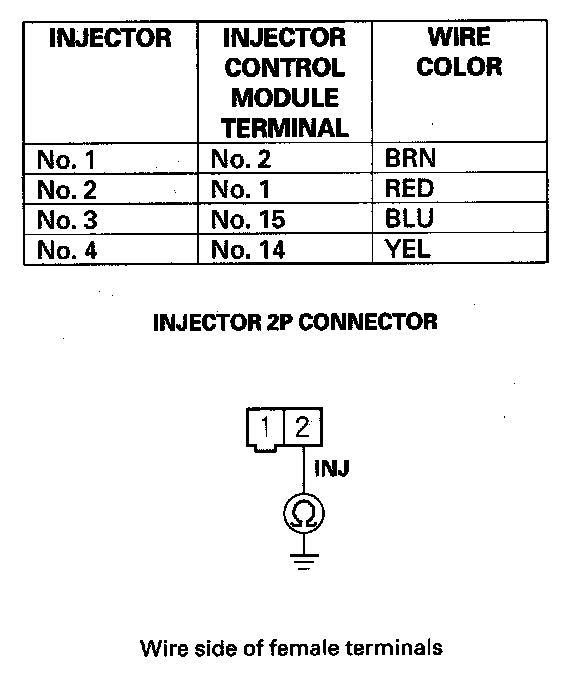 4. Check for continuity between each injector 2P connector terminal No. 2 and body ground (see table).