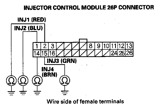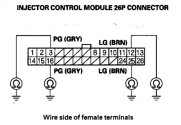 13. Check for continuity between body ground and injector control module 26P connector terminals No. 3, No. 12, No. 16, and No. 25 individually.