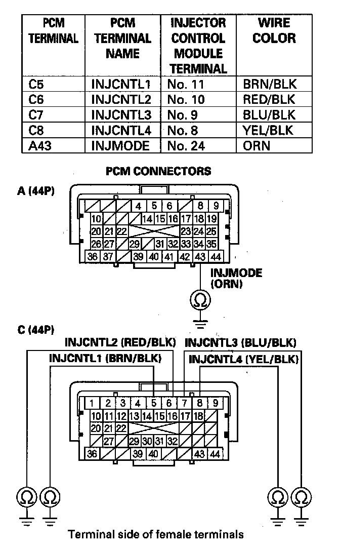 9. Check for continuity between body ground and the PCM connector terminals (see table).