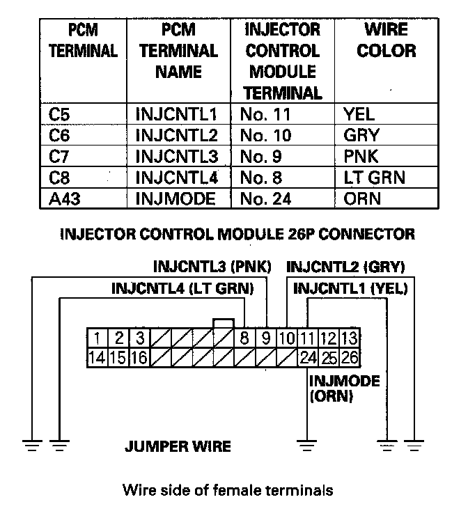 10. Connect injector control module 26P connector terminals No.8, No.9, No.10, No.11, and No.24 to body ground with a jumper wire.