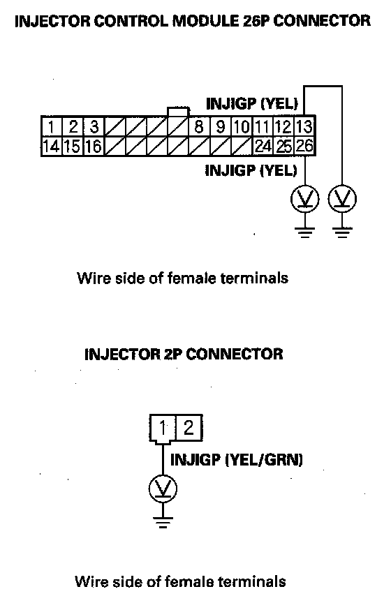 12. Turn the ignition switch ON (II), then measure voltage between body ground and injector control module 26P connector terminals No.13, No.26, and injector 2P connector terminal No.1 within 2 seconds.
