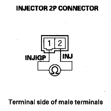 21. At injector side, measure resistance between injector 2P connector terminals No. 1 and No. 2.