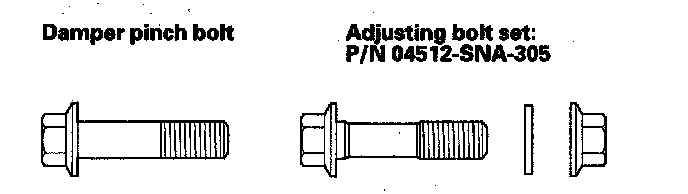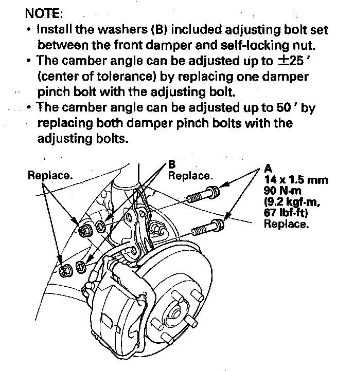The front camber can be adjusted by exchanging one or both of the damper pinch bolts with a smaller diameter adjusting bolt. The difference between the adjusting bolt diameter and the pinch bolt hole diameter allows for a small range of adjustment.
