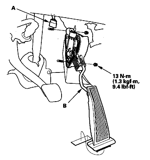 2. Remove the accelerator pedal module (B).