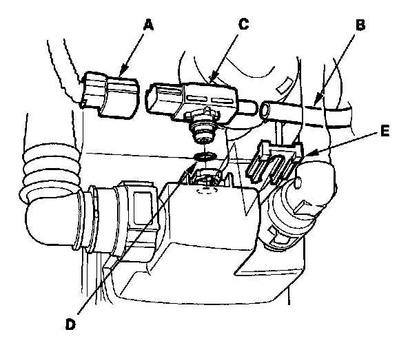 4. Install the parts in the reverse order of removal with a new O-ring (D) and a new retainer (E).