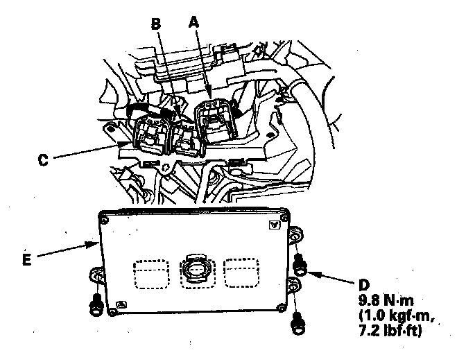 10. Remove the bolts (D), then remove the ECM/PCM (E).
