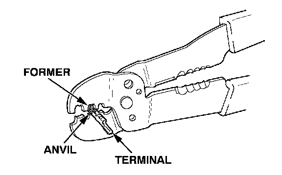 4. Position the terminal in the crimping tool slot with the solid portion of the terminal toward the anvil and the open section toward the former.