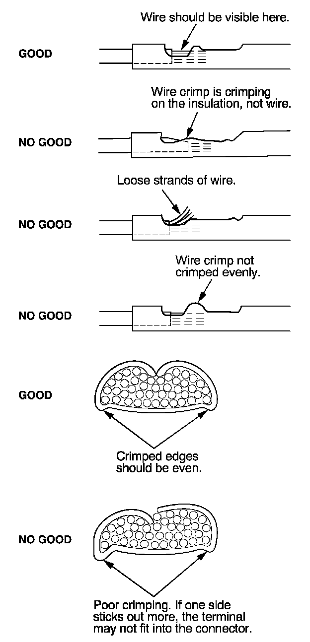 8. Inspect the quality of the wire crimp. If it has any of the following NO GOOD crimps, cut it off and start over.