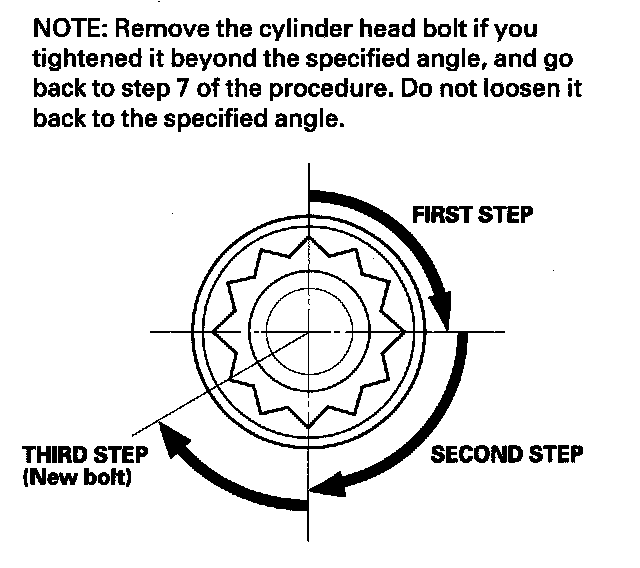 After torquing, tighten all cylinder head bolts in two steps (90° per step). If you are using a new cylinder head bolt, tighten the bolt an extra 60°