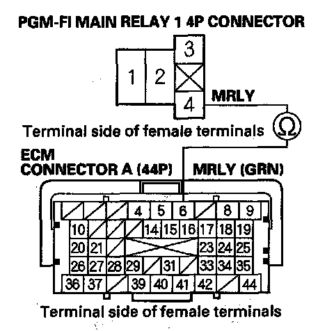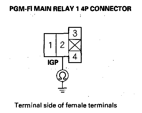 48. Check for continuity between PGM-FI main relay 1 4P connector terminal No. 2 and body ground.