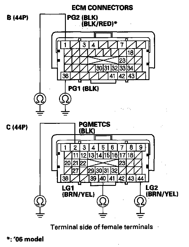 77. Check for continuity between body ground and ECM connector terminals B1, B36, C2, C40, and C44 individually.