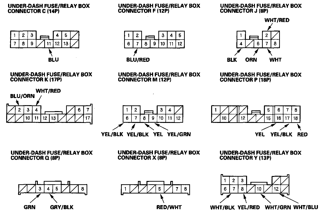 2. Disconnect the under-dash fuse/relay box connectors C, F, J, K, M, P, Q, X and Y.