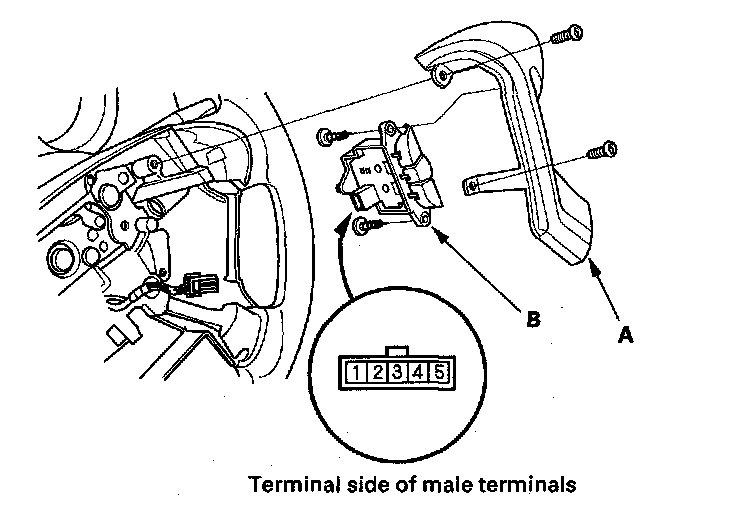 2. Remove the cover (A), then remove the cruise control set/decel, resume/accel, cancel switch (B).