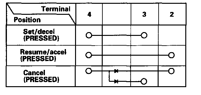 - If there is continuity, and it matches the table, but switch failure occurred on the cruise control input test, check and repair the wire harness on the switch circuit.