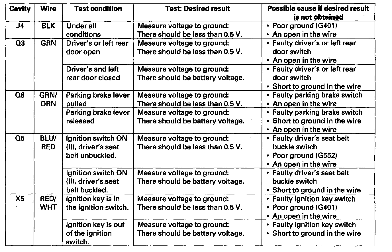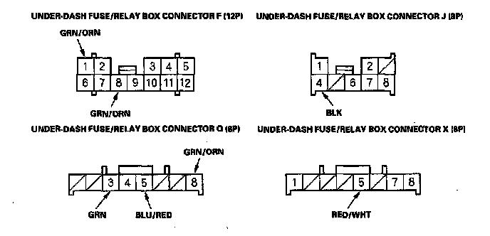 11. Reconnect the connectors to the under-dash fuse/relay box, and make these input tests at the appropriate connectors on the under-dash fuse/relay box.