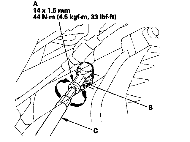 3. Loosen the tie-rod locknuts (A) while holding the flat surface sections (B) of the tie-rod end with a wrench, and turn both tie-rod arm (C) until the front toe is within specifications.