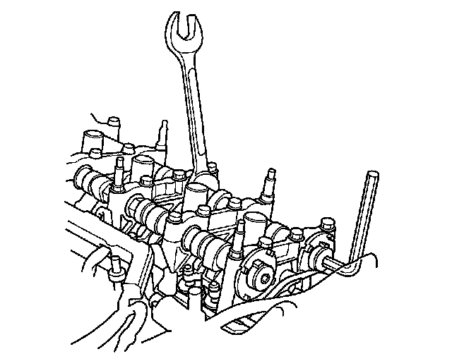 2. Hold the exhaust camshaft with an open-end wrench, then loosen the bolt.