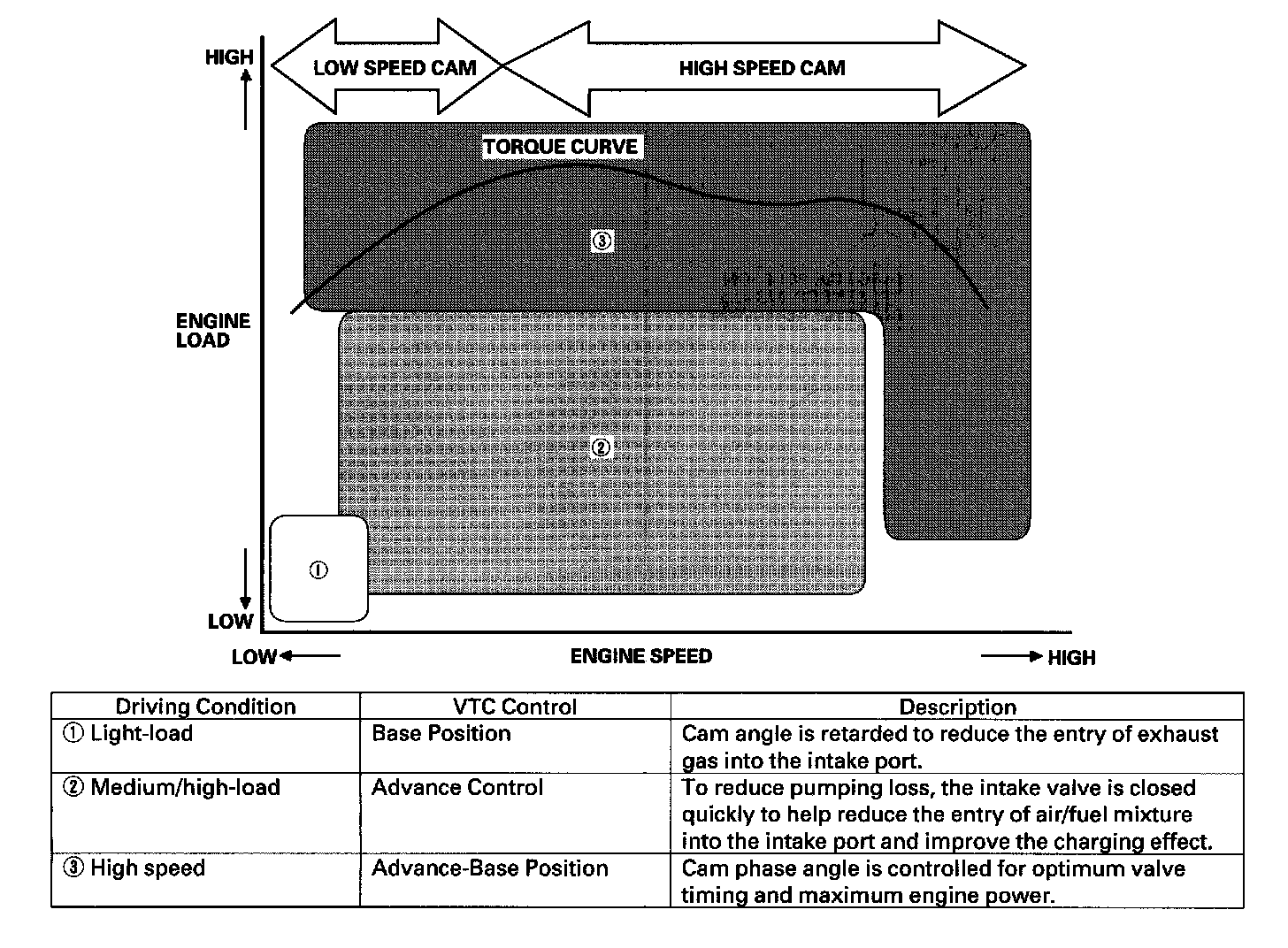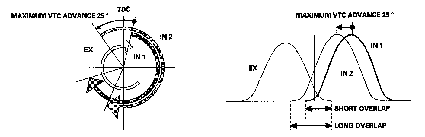 - The VTC system makes continuous intake valve timing changes based on operating conditions.